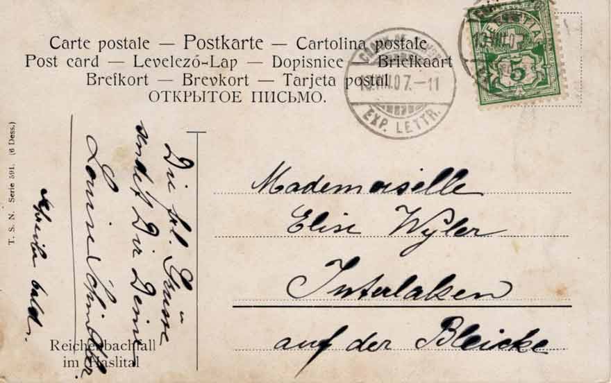 CH, Meiringen, Reichenbachfall im Haslital – Rs: T.S.N. Serie 591, beschrieben Stempel 13.8.07 – Postkarte farbig, Felsen, Wasserfall, Wald, Berner Oberland, Schweiz