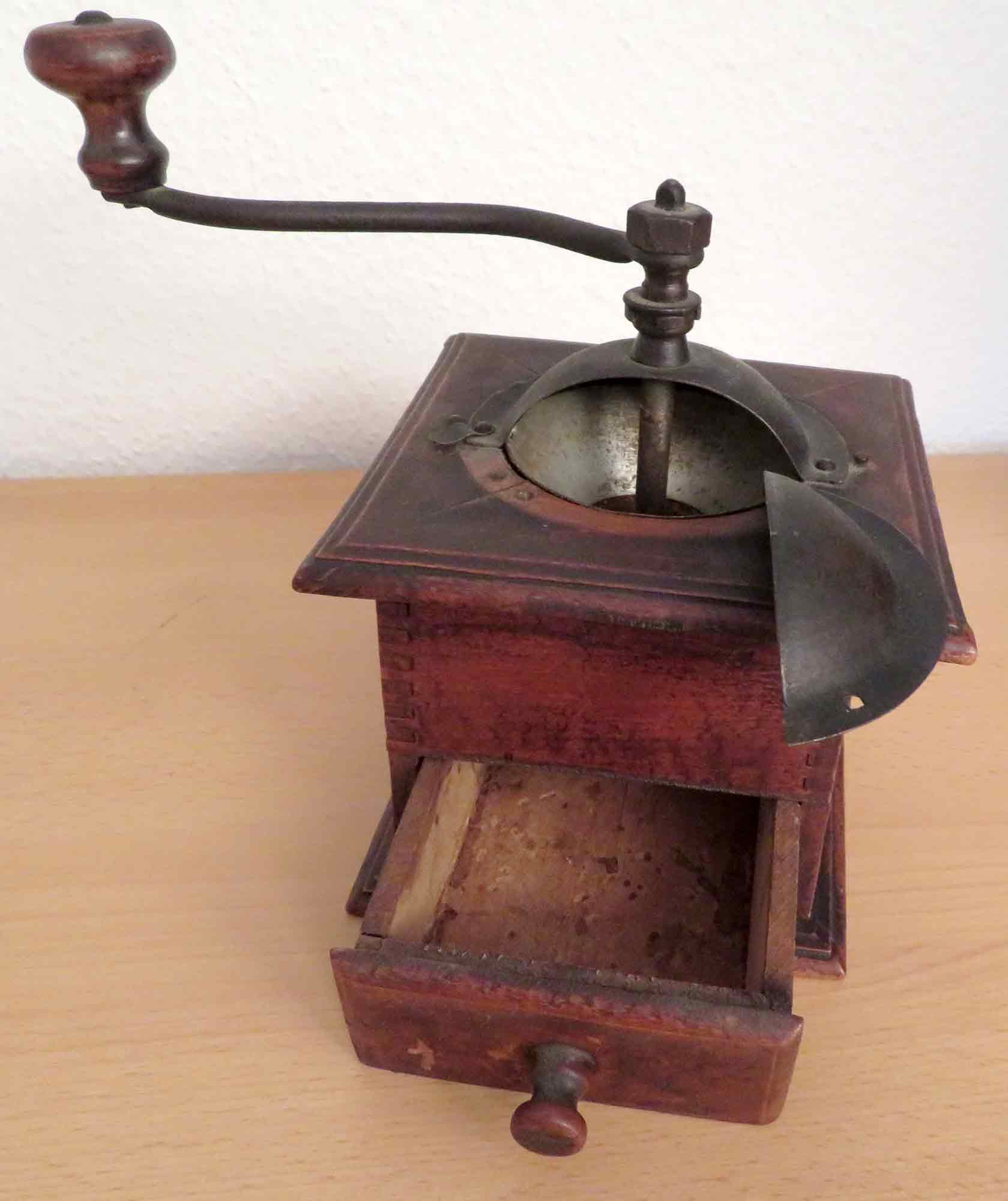 Kaffeemühle, Holz dunkel, antik – Quadratisch 14x14cm, Höhe bis Griff 20cm, Schublade, funktionsfähig
